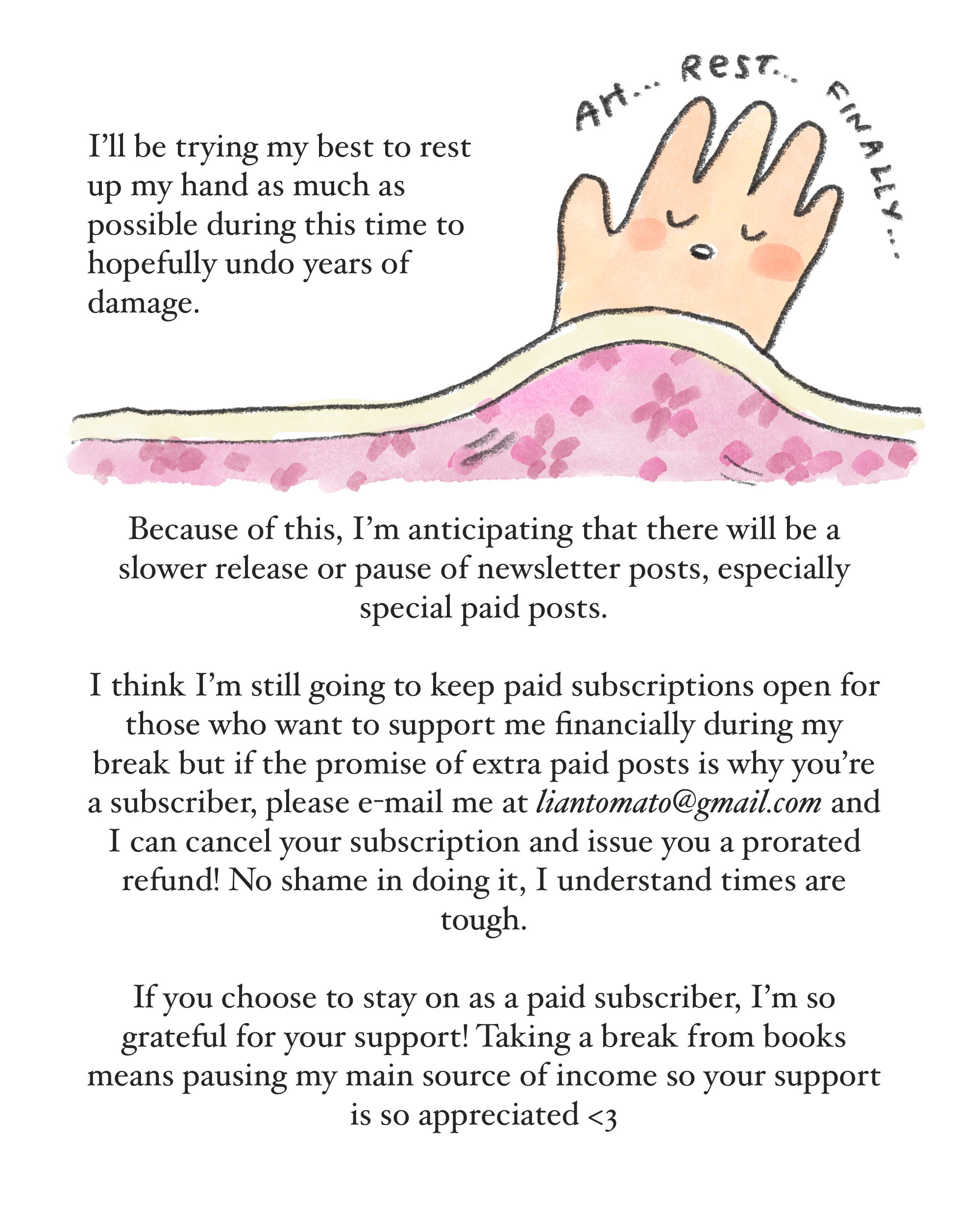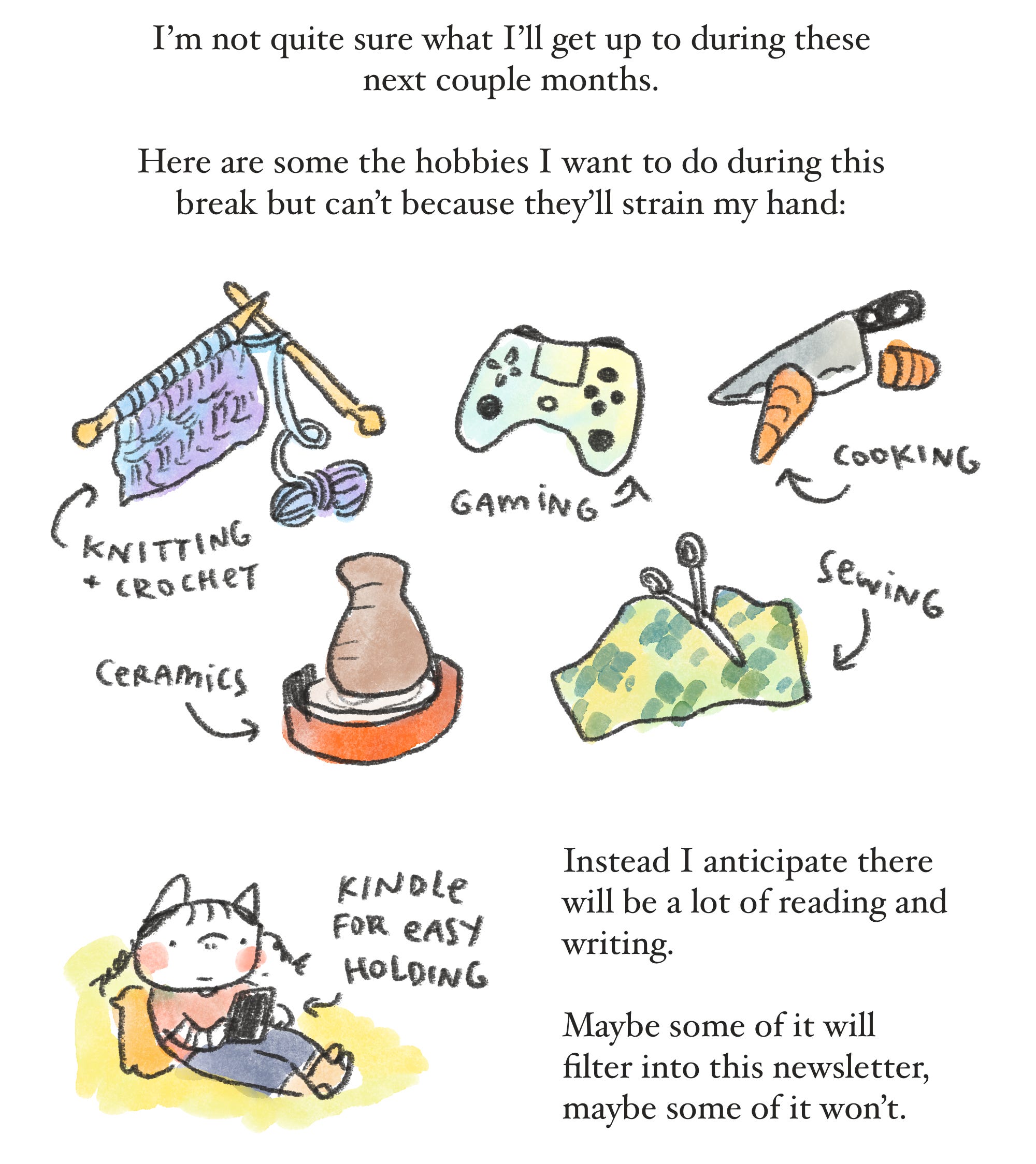 I feel like ever since the start of this newsletter I’ve been talking about my hand hurting so it finally felt like it was time to do something about it and give it the proper break it deserves. Historically I’ve tried to take breaks in the past and they have been to some varying degree of success. This will be the longest break so far and definitely feels more official as I intentionally scheduled it.